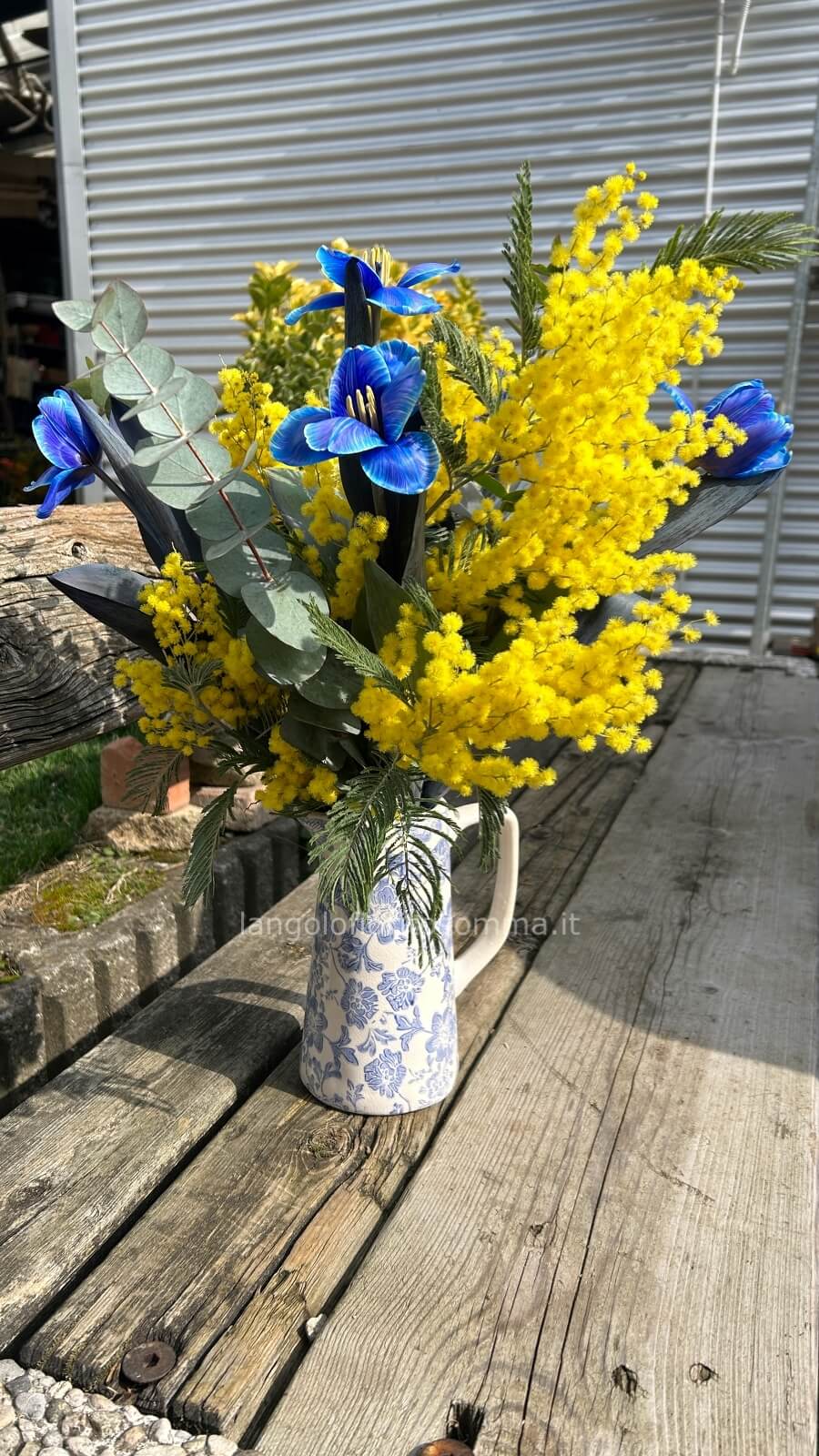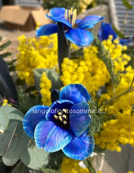Brocca con mimosa e tulipani blu